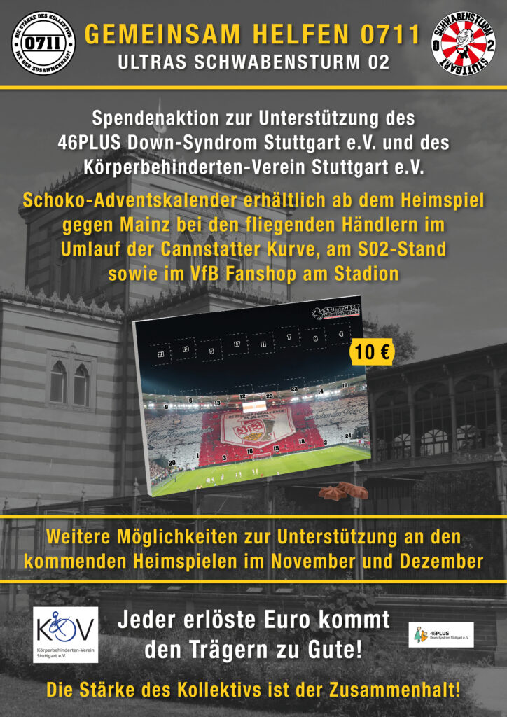 Darüber hinaus sind die Kalender ab Sonntag auch im VfB-Fanshop am Stadion erhältlich. Für Sammelbestellungenvon Fanclubs usw. wendet euch bitte per Mail an gemeinsamhelfen@schwabensturm02.net.